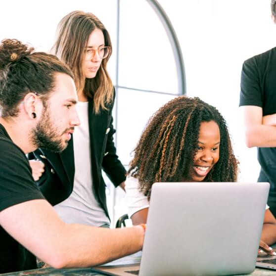 Image representing the 'Data Protection and Privacy' course, showing four employees curiously looking at a computer screen, hey are participating in the course. This visual captures their engagement and interest in learning about data privacy and protection, highlighting the course’s focus on educating employees on critical aspects of data security and privacy best practices in the workplace.